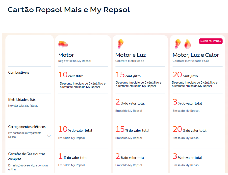 - Savings of up to €0.20/l on each refueling and accumulation of 3% of the purchase amount as credit on all Repsol products and services, except tobacco or related products, newspapers, magazines, books, and Santa Casa games.